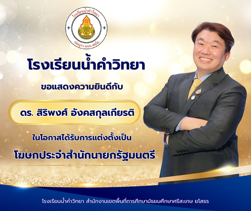 โรงเรียนน้ำคำวิทยา สำนักงานเขตพื้นที่การศึกษามัธยมศึกษาศรีสะเกษ ยโสธร ขอแสดงความยินดีกับ ดร.สิริพงศ์ อังคสกุลเกียรติ ในโอกาสได้รับการแต่งตั้งเป็น โฆษกประจำสำนักนายกรัฐมนตรี