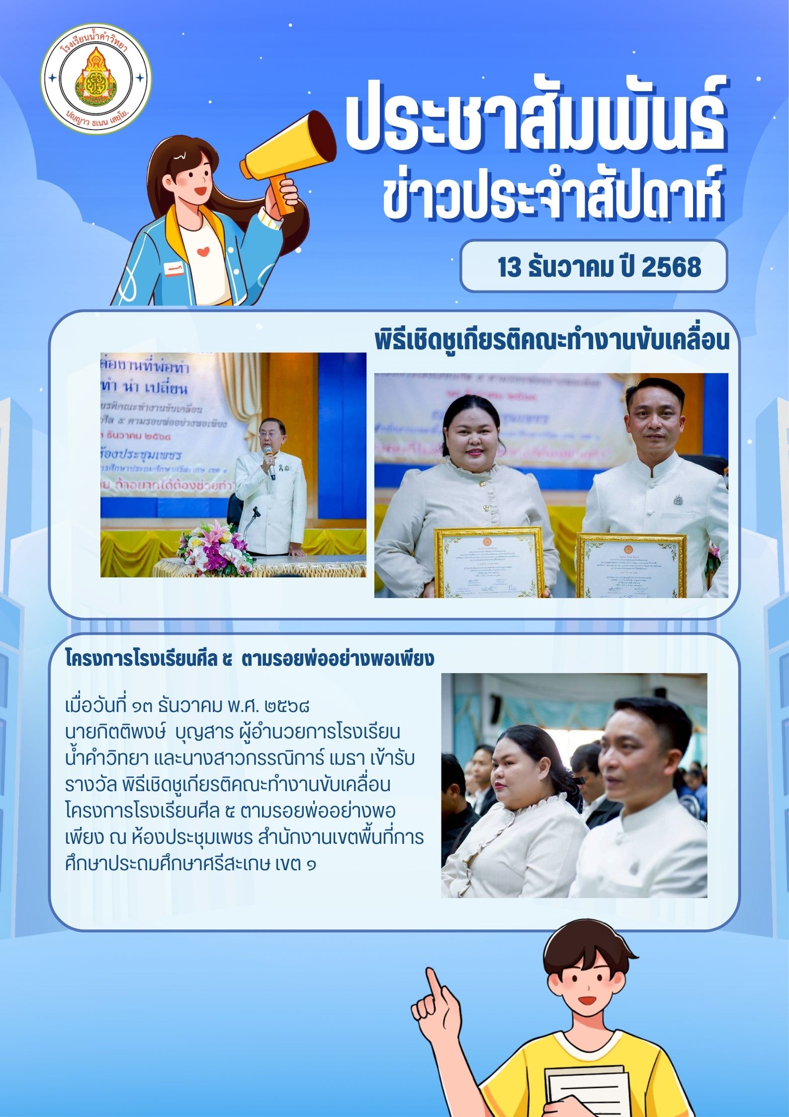 | มื่อวันที่ ๑๓ ธันวาคม พ.ศ. ๒๕๖๘ นายกิตติพงษ์ บุญสาร ผู้อำนวยการโรงเรียนน้ำคำวิทยา และนางสาวกรรณิการ์ เมธา เข้ารับรางวัล พิธีเชิดชูเกียรติคณะทำงานขับเคลื่อน โครงการโรงเรียนศีล ๕ ตามรอยพ่ออย่างพอเพียง ณ ห้องประชุมเพชร สำนักงานเขตพื้นที่การศึกษาประถมศึกษาศรีสะเกษ เขต ๑ |